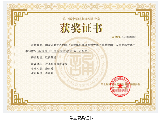 日前,由教育部、国家语委主办的第七届中华经典诵写讲大赛评选结果揭晓。我校师生表现突出,共获得教师组一等奖1项、大学生组优秀奖2项。