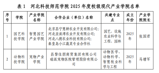 为贯彻落实教育部、工业和信息化部关于《现代产业学院建设指南(试行)》(教高厅函〔2020〕16号)和河北省教育厅、工信厅关于《河北省现代产业学院建设实施方案》(冀教高函〔2021〕48号)等文件要求,结合我校《现代产业学院设置与管理办法(试行)》(校教字〔2024〕30号)及“十四五”发展规划与专业建设实际,学校组织开展了2025年校级现代产业学院的申报与评审工作,共收到“智慧园艺产业学院”等2个校级现代产业申报材料,学校产教融合协同育人工作办公室组织专家论证,现将结果予以公示,公示时间为2025年12月1日至12月3日,如有异议,请以书面形式实名反馈至教务处实践教学科,逾期不予受理,联系电话:0335-8051300。名单公示如下: